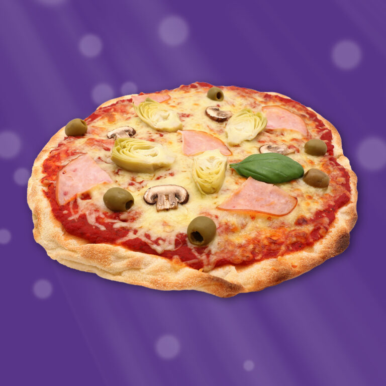 Pizza Originale, Gusto San Marzano Tomaten Sauce, Fior di Latte Mozzarella, Prosciutto di Tacchino, schwarze Oliven, Artischocken, Champignons