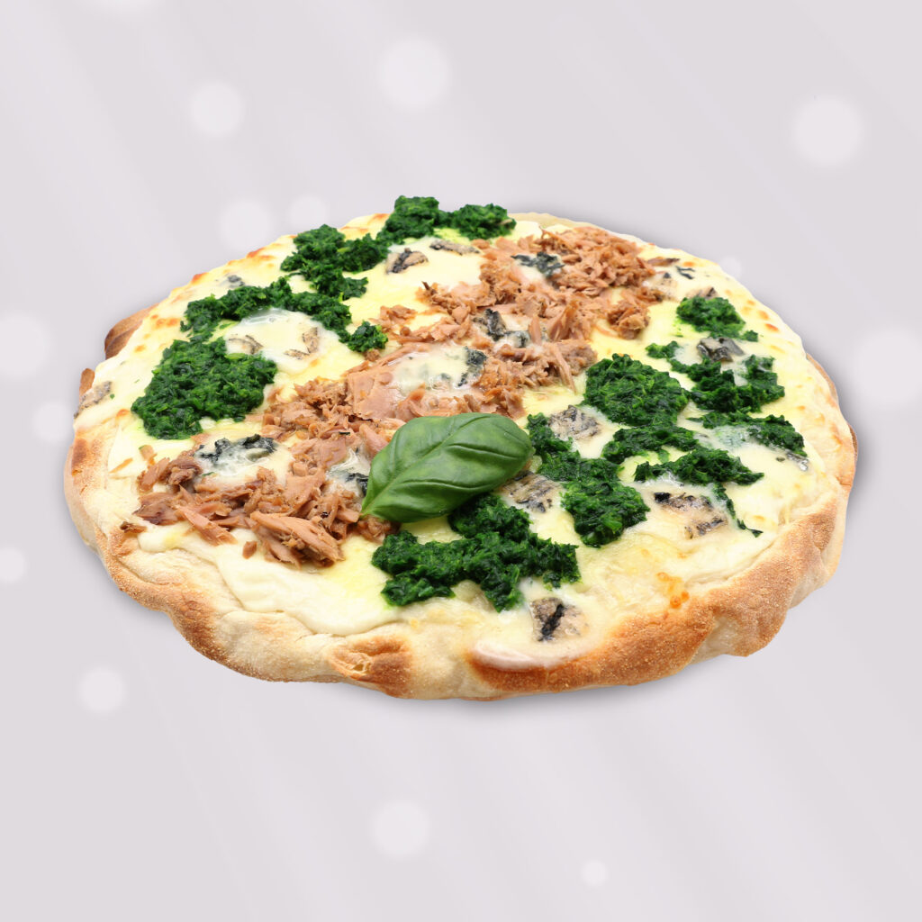 Pizza Bianca, Fior di Latte Mozzarella, Thunfisch, Spinat, Gorgonzola, Knoblauch